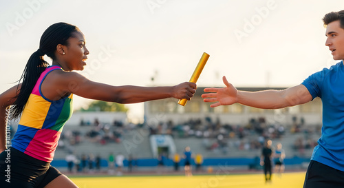 © Nur, Fototapeta premium Relay Race Success Teamwork and Partnership Concept Achieved Goal in Sports Business Competition Handing Off the Baton in a Dynamic and Powerful Moment of Triumph