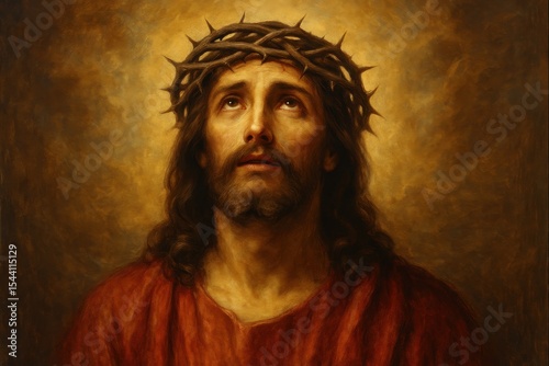 Fototapeta premium Religious artwork depicting Jesus Christ with crown of thorns in spiritual...