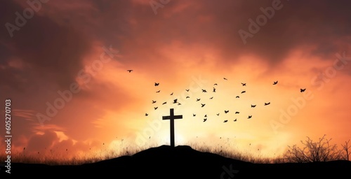 Fototapeta premium Religious concept: Silhouette cross and birds flying on sunrise background, Generative AI