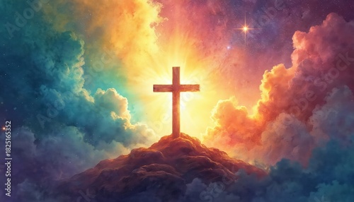 © Viktor, Fototapeta premium Religious cross on hill surrounded by colorful cosmic clouds and stars. Divine light shines brightly from behind. Represents faith hope and spiritual connection to the universe.