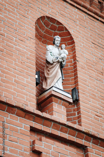 Naklejka premium Religious sculptures on the brick wall, house of the sisters of the Order of...
