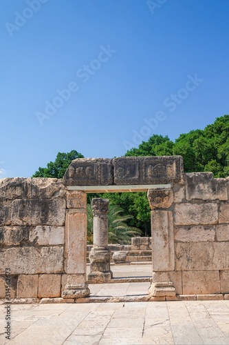 Naklejka premium Remains of a Synagogue in the old fishing village Capernaum, Israel. Blue...