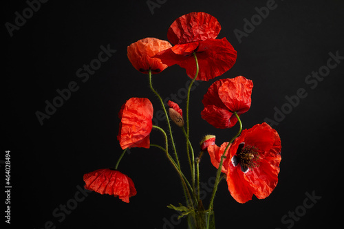 © vetre, Fototapeta premium Remembrance Day greeting card. Beautiful red poppies flowers on black background. Lest we forget.