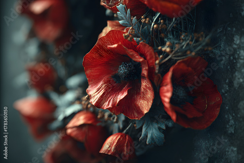 © Masha, Obraz premium Remembrance Day Poppy Wreath Mounted on Wall. World War remembrance day.
