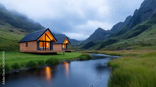 © Edhar, Fototapeta premium Remote cabins nestled by a tranquil river amidst mountains at dusk