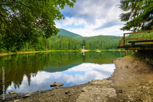 © Pellinni, Fototapeta premium remote mountain landscape with forest lake in summer. travel nature background of synevyr national park on a sunny day. scenic view of coniferous trees reflection in water. vacation season in ukraine