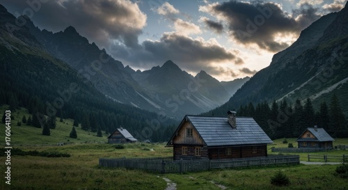 Obraz premium Remote wooden cabins in a vast mountain valley, surrounded by forests under a cloudy sky