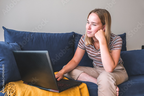 Fototapeta premium Remote work.Girl freelancer works remotely on the seashore.workation, remote...