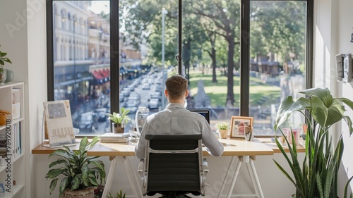 © AnnaFocusArt, Naklejka premium Remote worker in a cozy Melbourne office with street and park view
