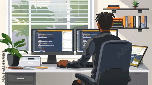 © farhan, Fototapeta premium remote worker using a desktop computer with dual monitors, working on coding projects in a tidy home office