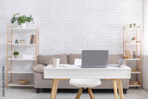 Fototapeta premium Remote workplace or home office during coronavirus outbreak. Sofa, chair, table with laptop, cup and notepad in living room interior