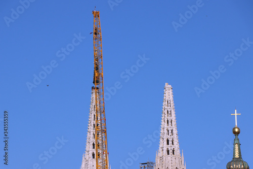 © smuki, Obraz premium Removal part of the left tower of Zagreb Cathedral, damaged in the earthquake of March 22. 2020. The right tower itself collapsed.