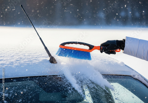 © mashfiqur, Naklejka premium Removing snow from car roof with brush