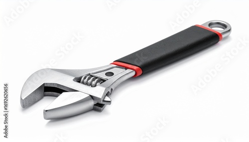 © Graphiloom, Obraz premium Render a metallic adjustable wrench with long handle, hanging hole, and movable jaw mechanism, isolated on white background, emphasizing mechanical utility, durability, and tool design.