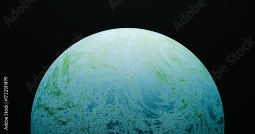 © Mirella, Fototapeta premium Render 3D de um planeta/exoplaneta azul com veios esverdeados e iluminação suave, recortado contra fundo espacial escuro.