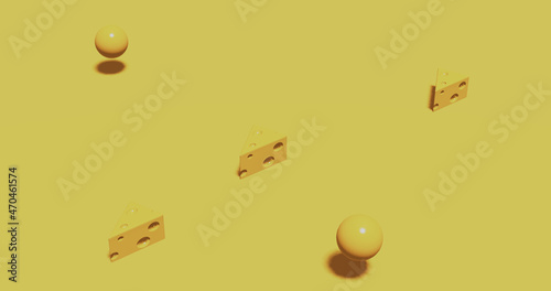 Fototapeta premium Render with yellow background with pieces of cheese in isometric