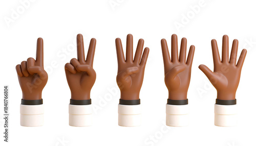 Obraz premium Rendered hands displaying the numbers one through five, against a solid black...