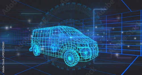 © vectorfusionart, Fototapeta premium Rendering cyan blue wireframe van model rotating in virtual CAD environment, showing HUD overlays