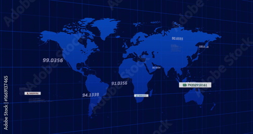 Fototapeta premium Rendering digital world map shapes over navy grid background, with floating numeric data labels