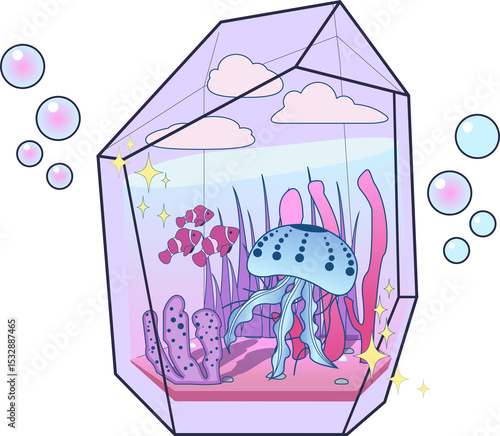 Fototapeta premium Rendering pastel aquarium: jellyfish, clownfish, coral seaweed in bubbles,...