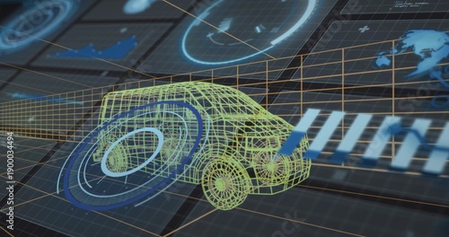 © vectorfusionart, Obraz premium Rendering yellow-green wireframe compact car rotating in virtual 3D simulation, with blue HUD rings