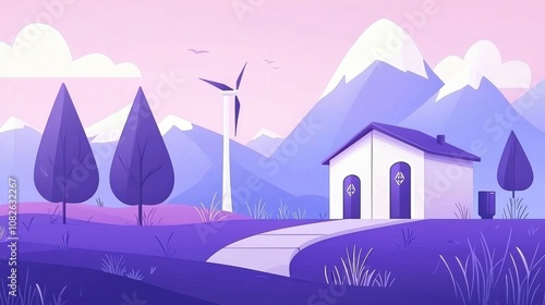 Fototapeta premium Renewable energy home mountain landscape digital illustration serene environment vibrant viewpoint eco-friendly concept