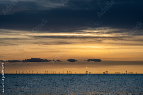 © Lance Bellers, Naklejka premium Renewable energy off the coast at dusk