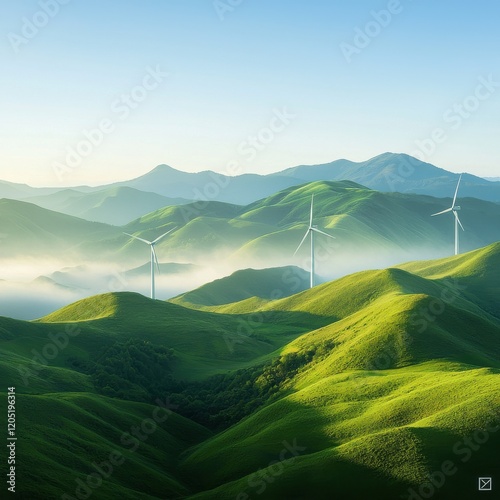 Fototapeta premium Renewable energy wind turbines in lush mountain landscape at sunrise nature...