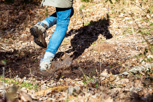 Fototapeta premium Rennen durch den Matsch. Schlamm. Wanderschuhe