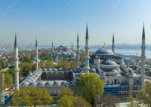 Naklejka premium Renovated Blue Mosque and Hagia Sophia Drone Video, April 2022 Fatih, Istanbul Turkey
