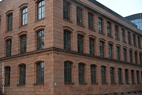 © Miroslaw, Fototapeta premium Renovated stylish red brick building with muntin windows on the corner