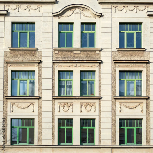 Fototapeta premium renovated vintage house main facade with decorated windows pattern, Gera city...