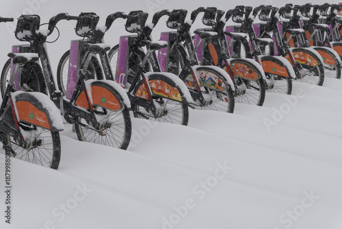 © eugen, Naklejka premium rental bikes during a snow storm on 2026-01-15 in Toronto