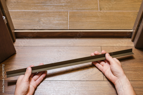 © simone_n, Obraz premium Repair, building and home concept. Construction worker fixing metal profile to the doorstep with adhesive.