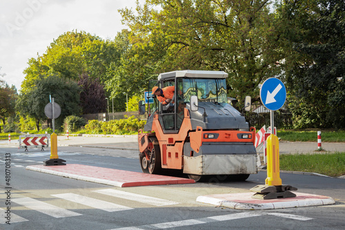 © Jan Kravа, Obraz premium Repair of the road and the skating rink lays asphalt