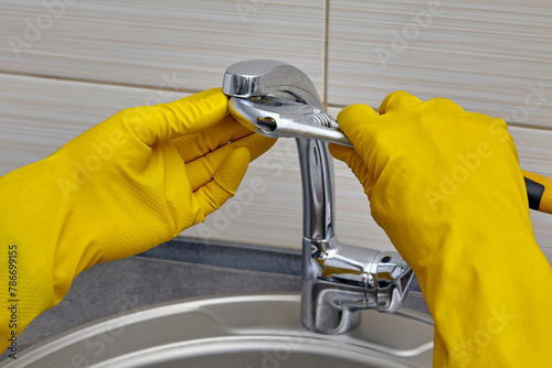 Fototapeta premium Repairman in yellow gloves with an adjustable wrench changes the faucet aerator