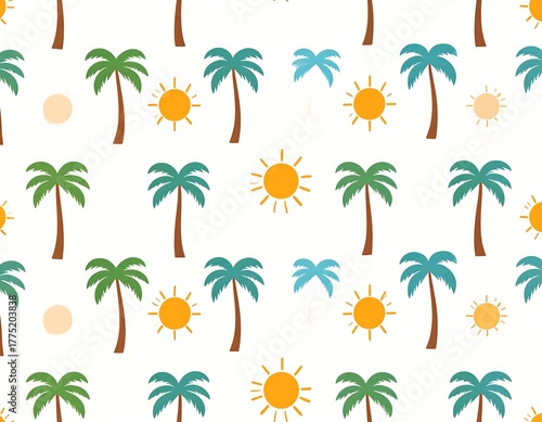 Obraz premium Repeated palm trees, suns, and circles create a seamless tropical pattern