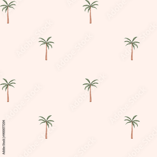 © WatercolorDigitalArt, Fototapeta premium Repeated pattern of palm trees on a light background for tropical-themed design projects and decor
