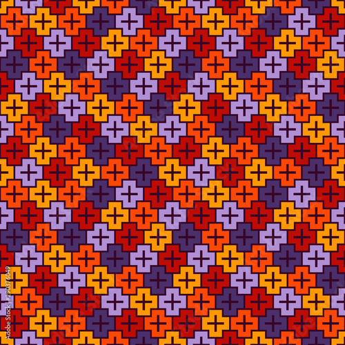 Fototapeta premium Repeated puzzle mosaic background. Seamless pattern in Halloween traditional colors with simple geometric ornament.