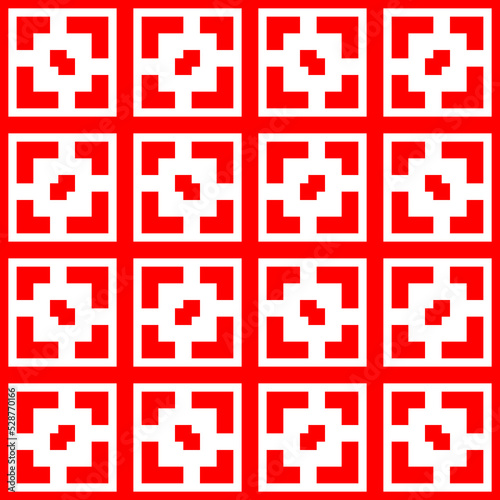 Fototapeta premium Repeated stylized red squares on white background. Quadrangles wallpaper. Seamless surface pattern design with symmetrical polygons ornament. Geometric motif. Digital paper for print. Vector art
