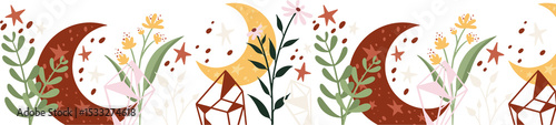 Fototapeta premium Repeating celestial botanical border showing moons and stars, crystals,...