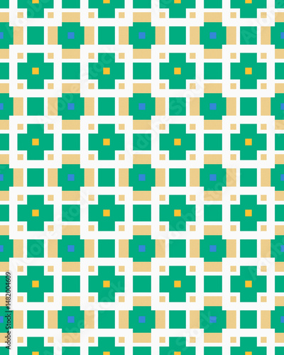 © Tabishere, Fototapeta premium Repeating geometric shapes create a vibrant pattern in teal, green, and yellow, ideal for fabric designs or interior decor elements