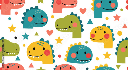 Fototapeta premium Repeating kawaii dinosaur heads with stars, hearts, and geometric dots. Ideal...