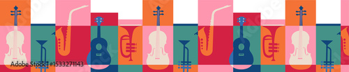 Naklejka premium Repeating multicolored tiles are featuring instrument silhouettes on...