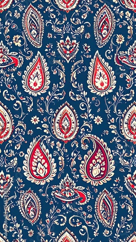 © Dyah, Fototapeta premium Repeating Paisley Pattern in Jewel Tones with Red and White Elements on Dark Blue Background