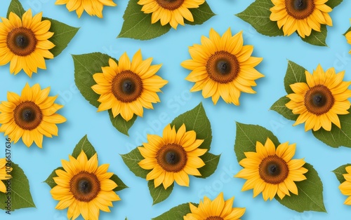 Obraz premium Repeating pattern of sunflowers with bold yellow petals and green leaves on a light blue background for a cheerful, natural vibe