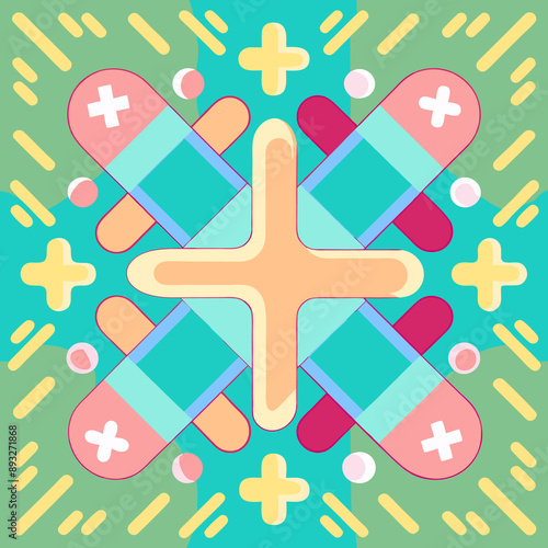 Fototapeta premium Repeating pattern with a light green background with an abstract pattern of crosses and other shapes in pastel colors.