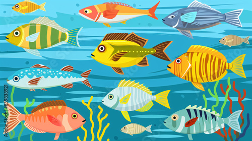 © Kanok, Naklejka premium Repeating pattern with colorful cartoon fish swimming in water