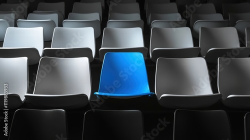 Fototapeta premium Repetitive blackandwhite stadium seats with one blue seat centered