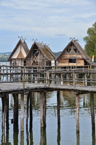 © wolfenheimer, Fototapeta premium Replica of medieval Stilt houses at lake Constance in germany - Unteruhldingen - Bodensee